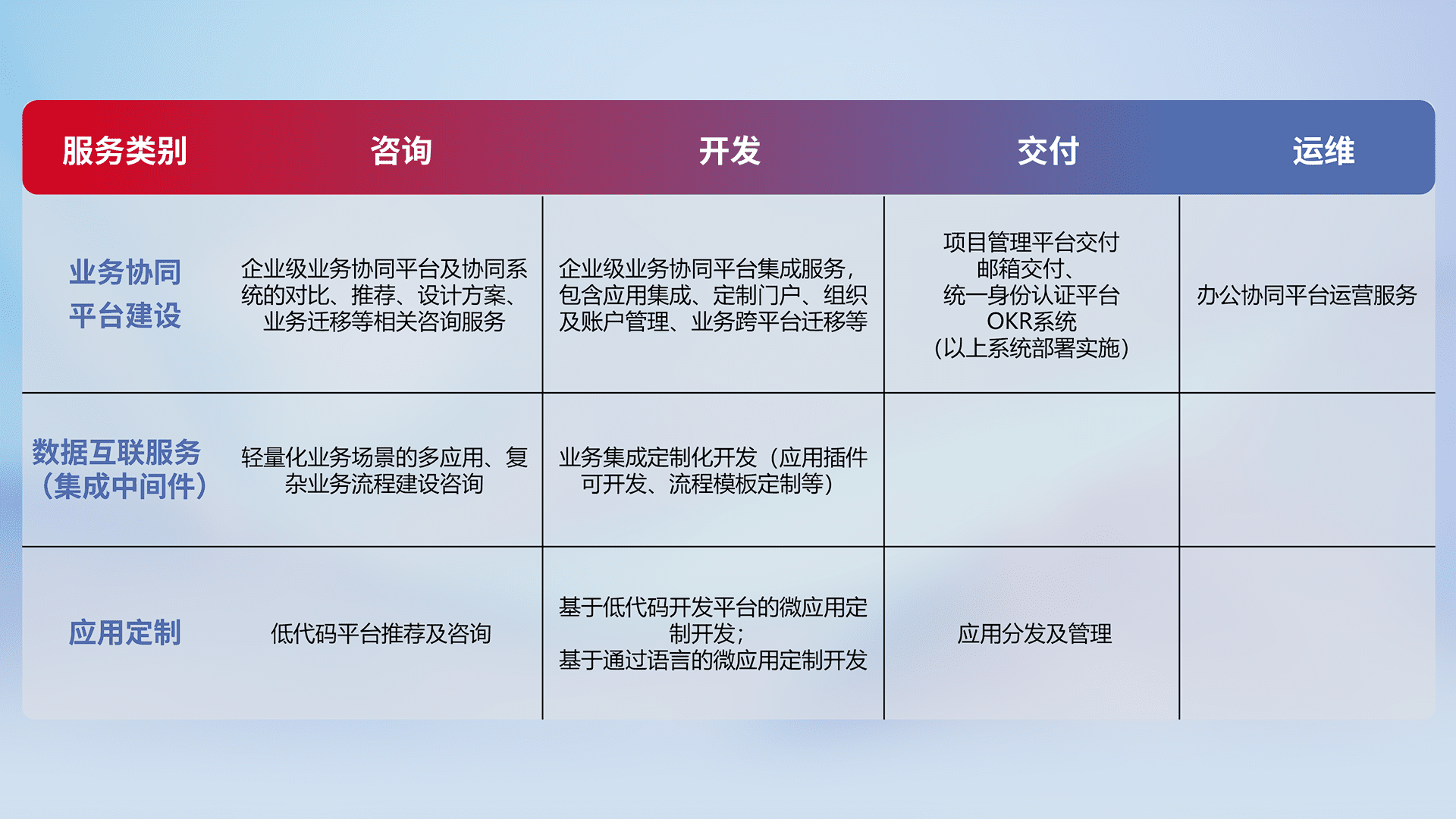 针对钉钉、、企微、、、IDaas等平台级产品提供产品的规划、、方案、、交付、、定制化开发等服务,,,实现如统一协同办公、、、智能客户服务、、、、混合会议管理、、、智能数据查询、、等业务场景,,实现数字化转型。。。