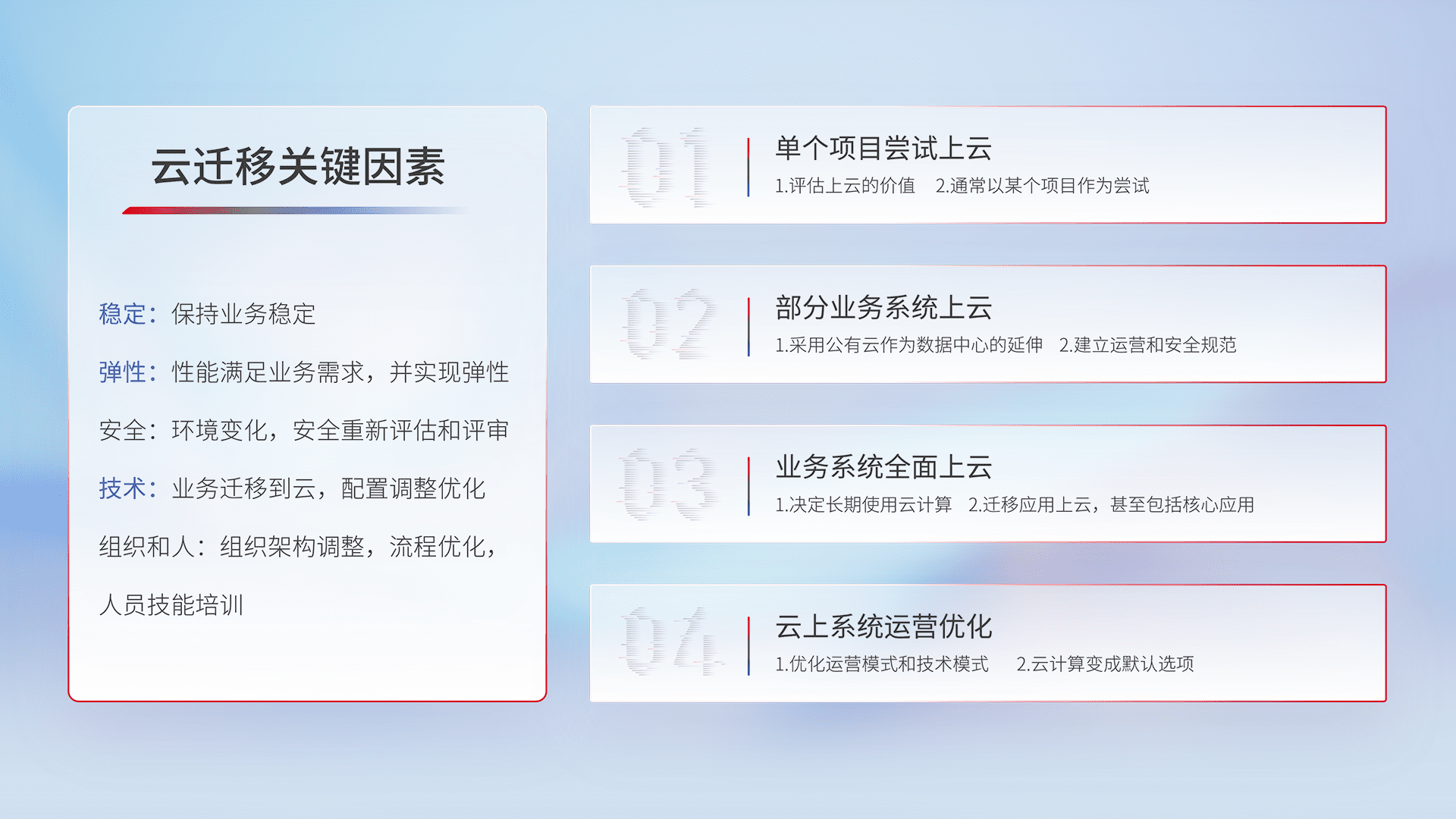 结合实际业务,,从规划设计、、云平台选型、、、、云原生改造、、、、数据迁移、、、集成交付,,,迁移全过程为客户识别最佳上云路径,,做好风险识别管理,,,,设计网络架构、、、、身份权限、、、、安全审计合规、、、、操作审计、、日志审计、、监控告警策略、、多站点容灾设计等,,对云上基础设施进行整体规划,,提升IT治理水平,,,,以满足弹性、、、、高可用、、、、高性能的需求。。。