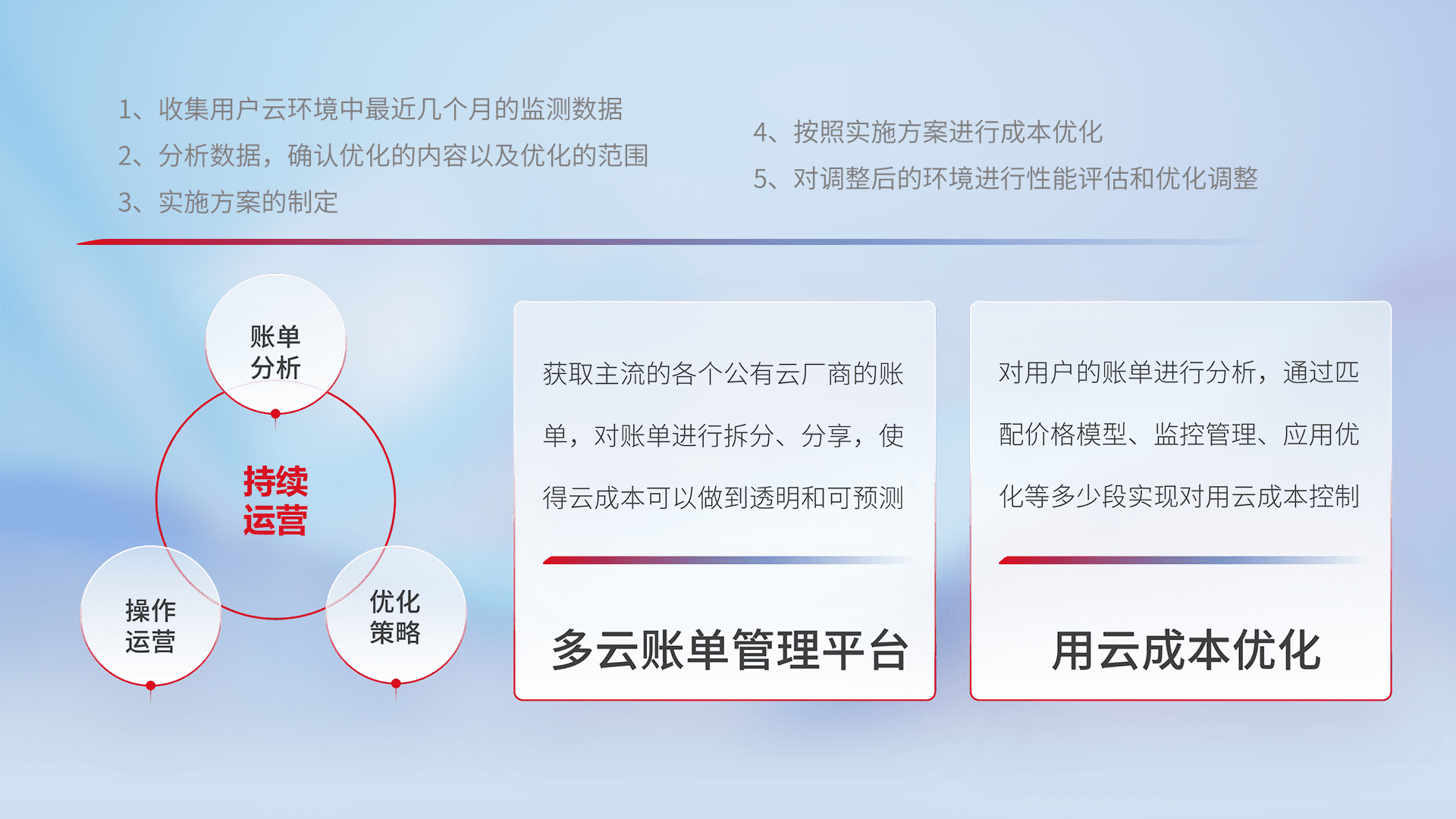通过多云纳管,,,以统一的资源数据模型把客户的云资源进行抽象和封装,,,进而实现对多云资源的统一操作,,,保障云资源管理的可靠性、、、稳定性与可用性。。。量身定制化运维内容,,配置、、开发运维、、、、补丁管理、、、备份、、、监控、、、、认证和访问管理、、、、审计和日常巡检等,,保障在用云过程中的可靠度,,,稳定度以及高可用率。。。